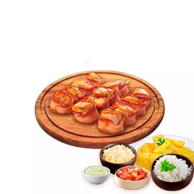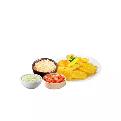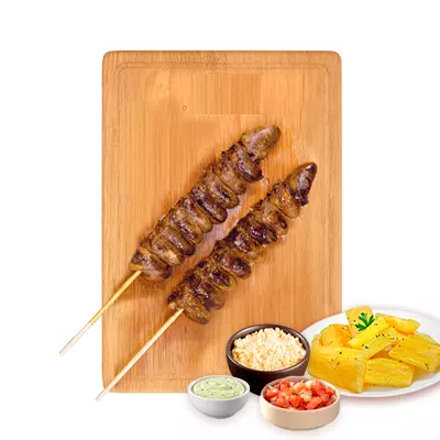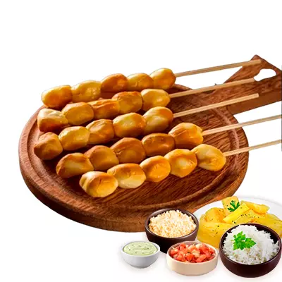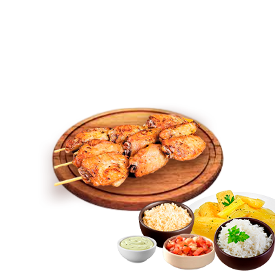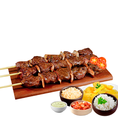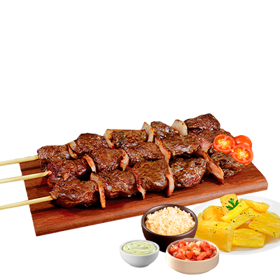 Espeto, mandioca, vinagrete, farofa e molho Com molhos de alho e pimenta