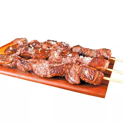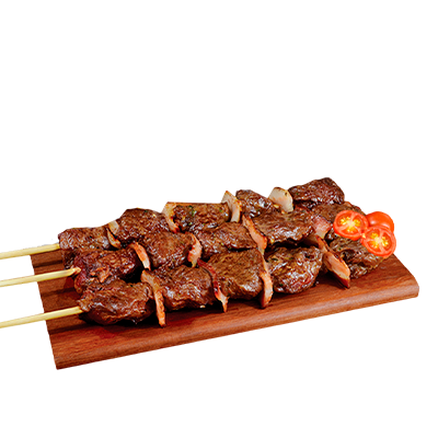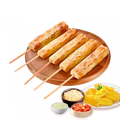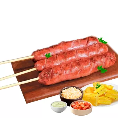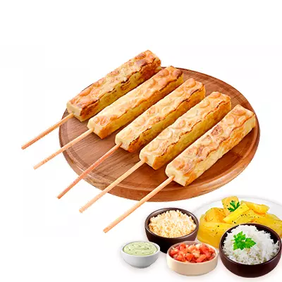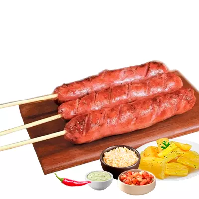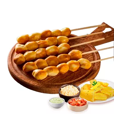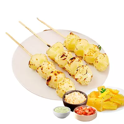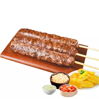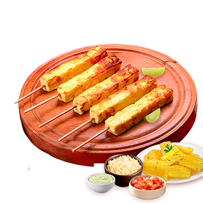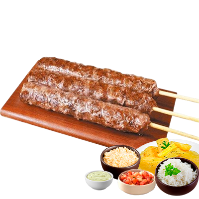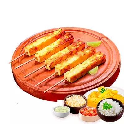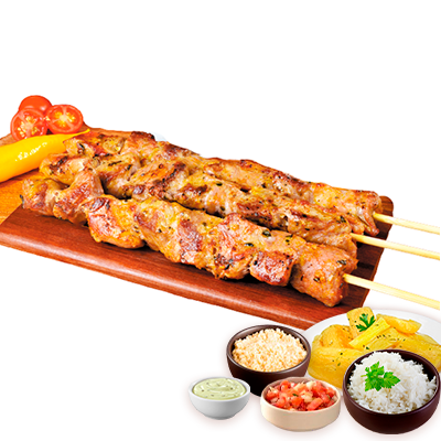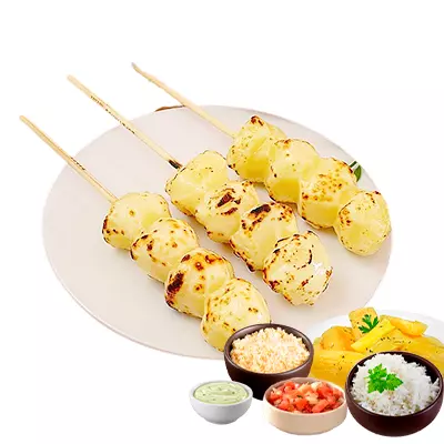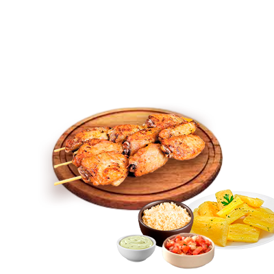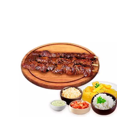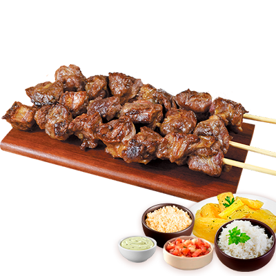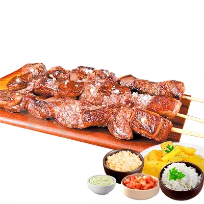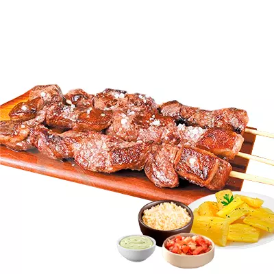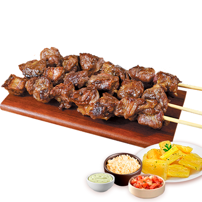 Espeto, mandioca, vinagrete, farofa, Com molhos de alho e pimenta