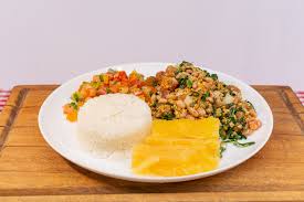 Mandioca, vinagrete, arroz Feijão tropeiro, com molhos de alho e pimenta