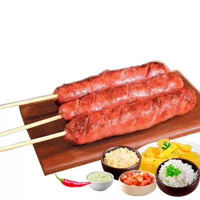 Espeto, mandioca, vinagrete, arroz Feijão tropeiro, com molhos de alho e pimenta